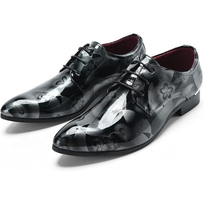 Men Dress Shoes Fashion Business Shoes Pointed Toe Floral Patent Leather Lace Up Oxford